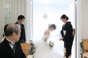 結婚式当日に新婦様がウェディングドレスを身にまとい、ベールをおろすのは身支度の仕上げです。