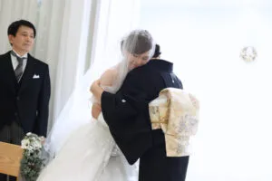 お母様からは、目の前にいらっしゃる花嫁様がどんな風に見えているのか、どんな景色なのだろうか、大切にお育てになられた娘様を見送るお母様のお姿は、本当に何度見ても感動いたします。