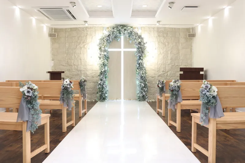 白を基調としたチャペルで、可愛らしい雰囲気にもキレイめな雰囲気にも似合います