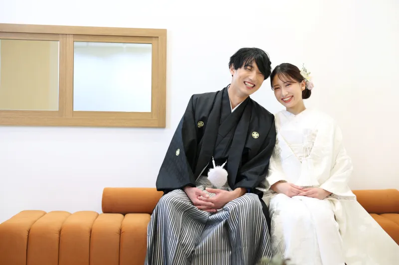 オレンジのソファが差し色になっていて、白無垢も映えて素敵です☆