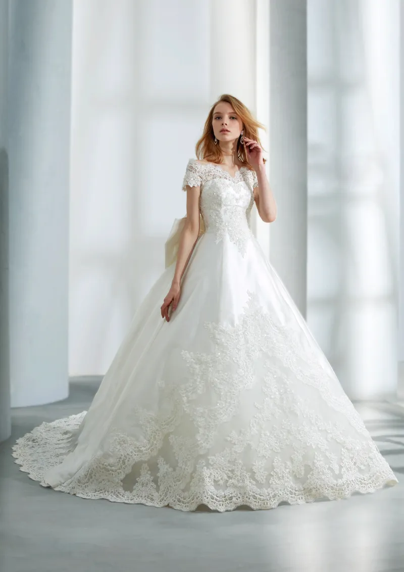 こちらは広がりを少し押さえた、落ち着いたウェディングドレスです♪