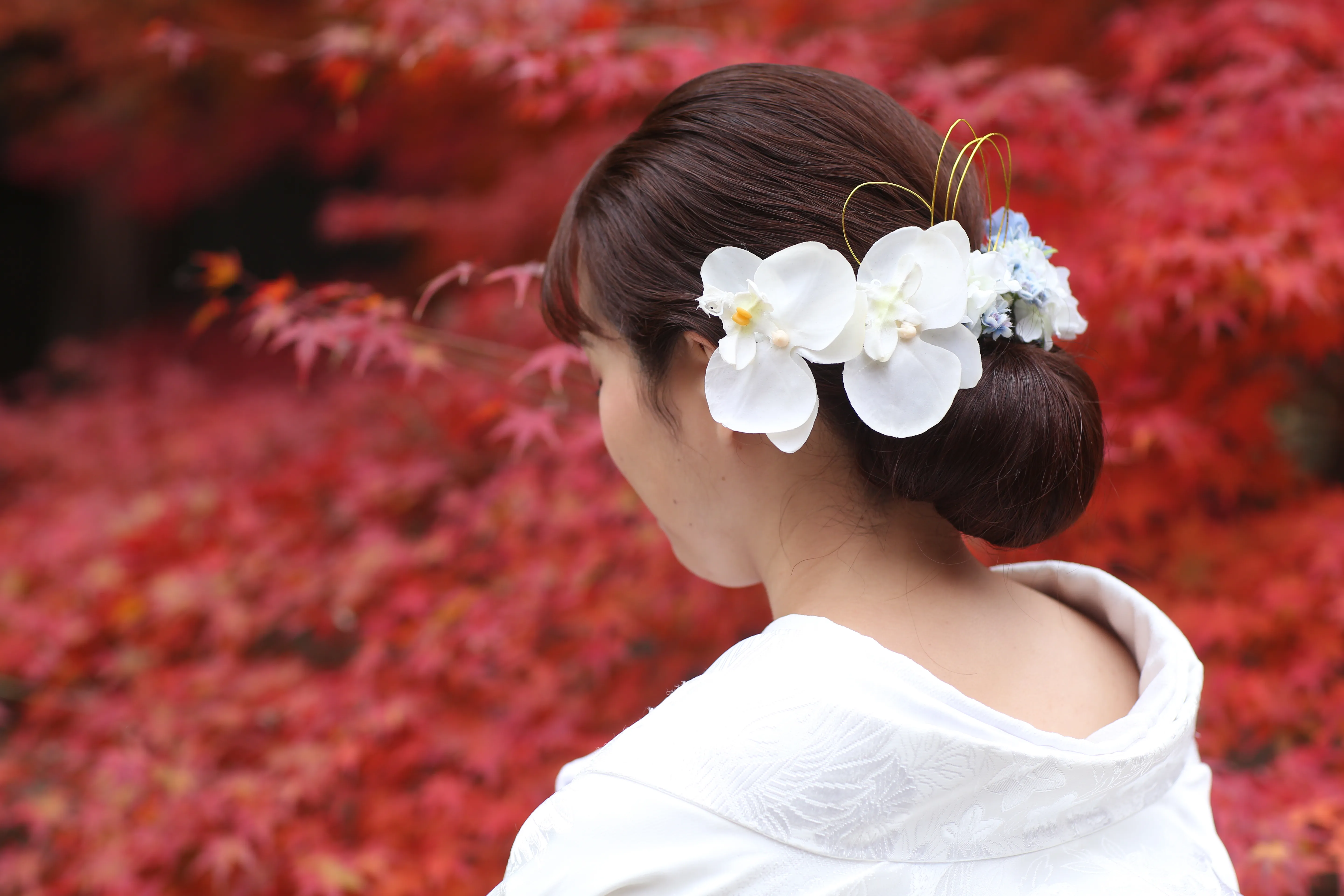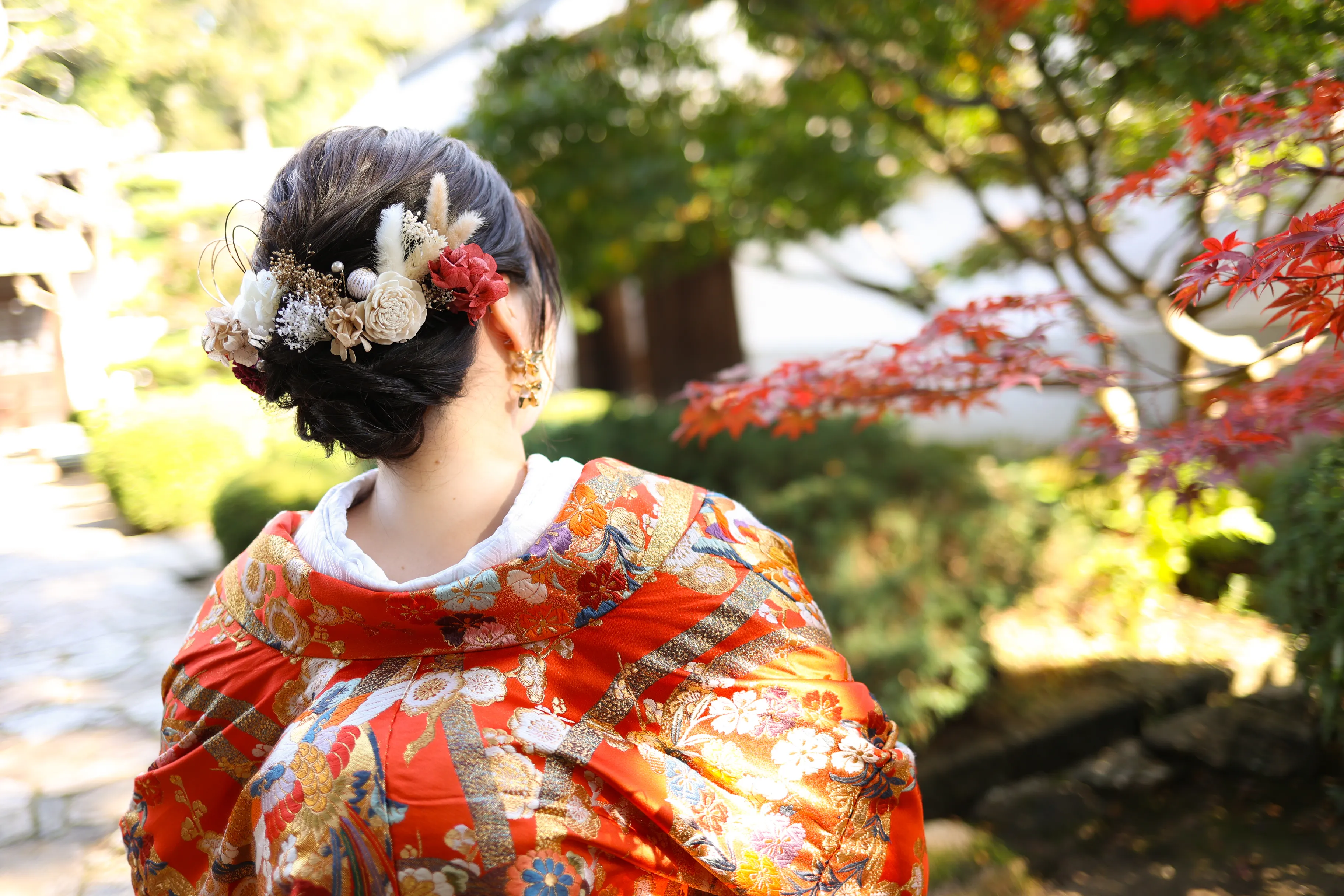 打掛に合わせたゴールドや赤色の造花が多く、