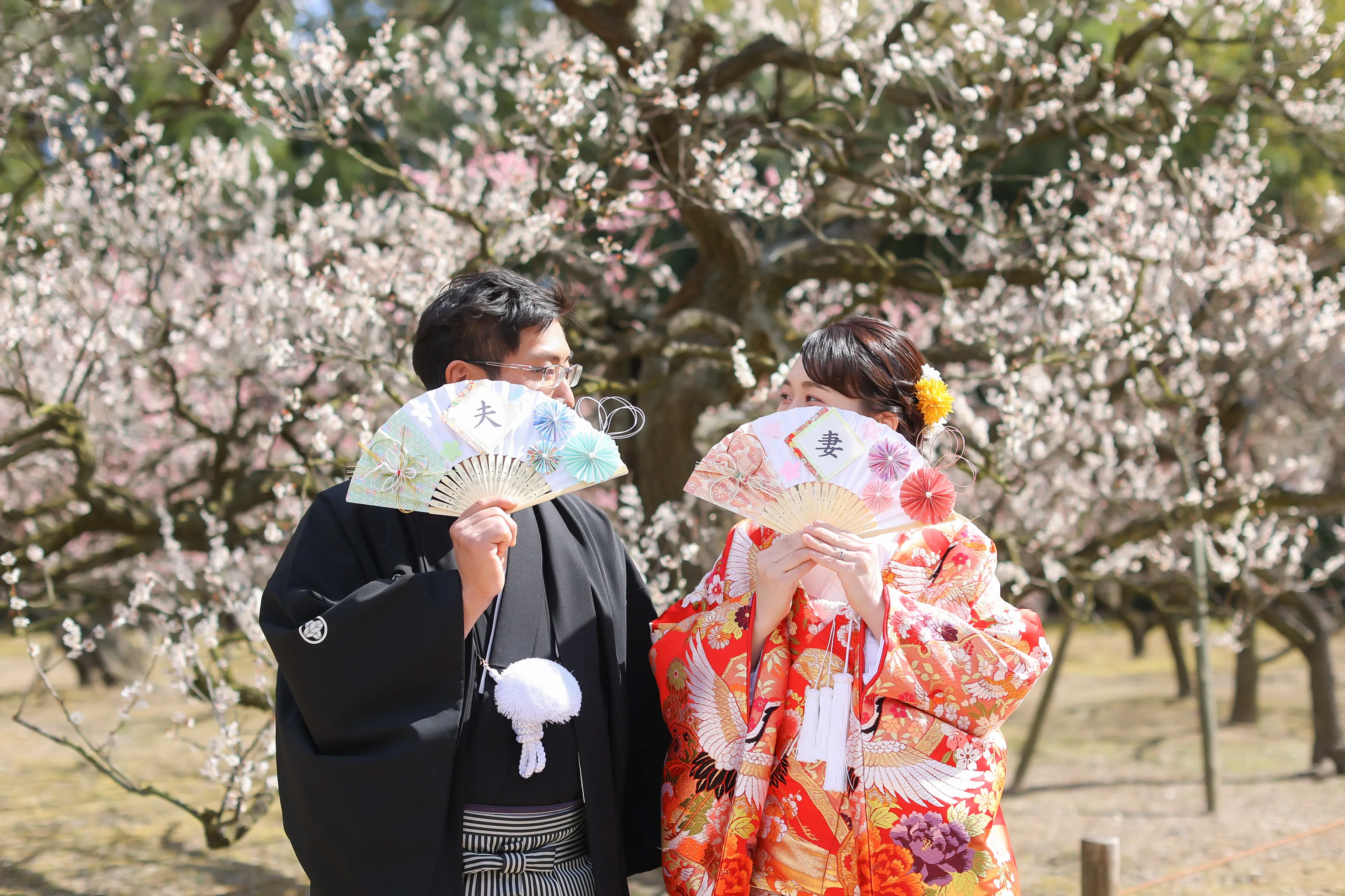 梅の木も色づいていた為、可愛いピンク色の木の下でニッコリ見つめあったり、