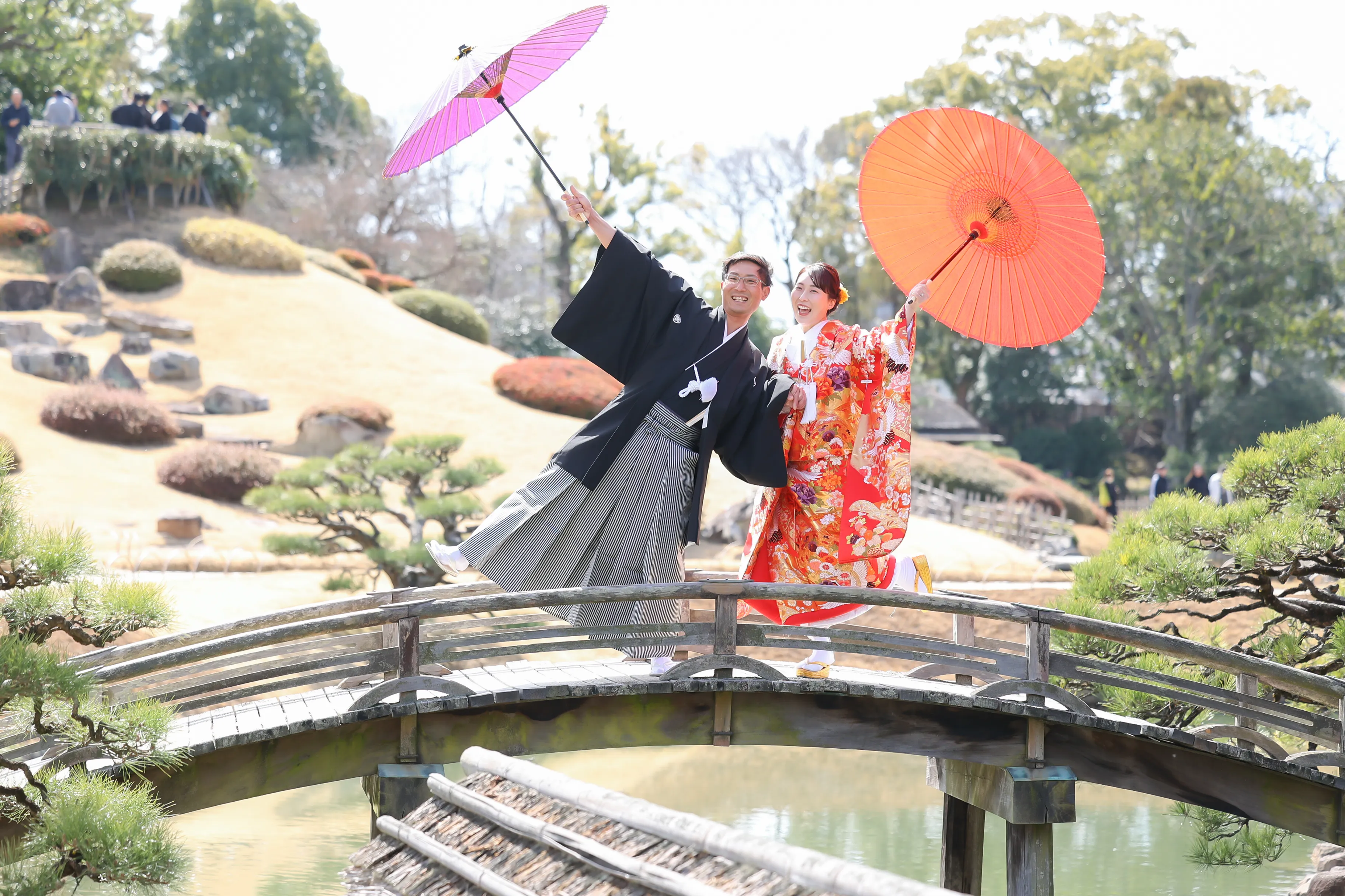 橋の上では、和傘を使用した楽しいショットをお撮りしました!